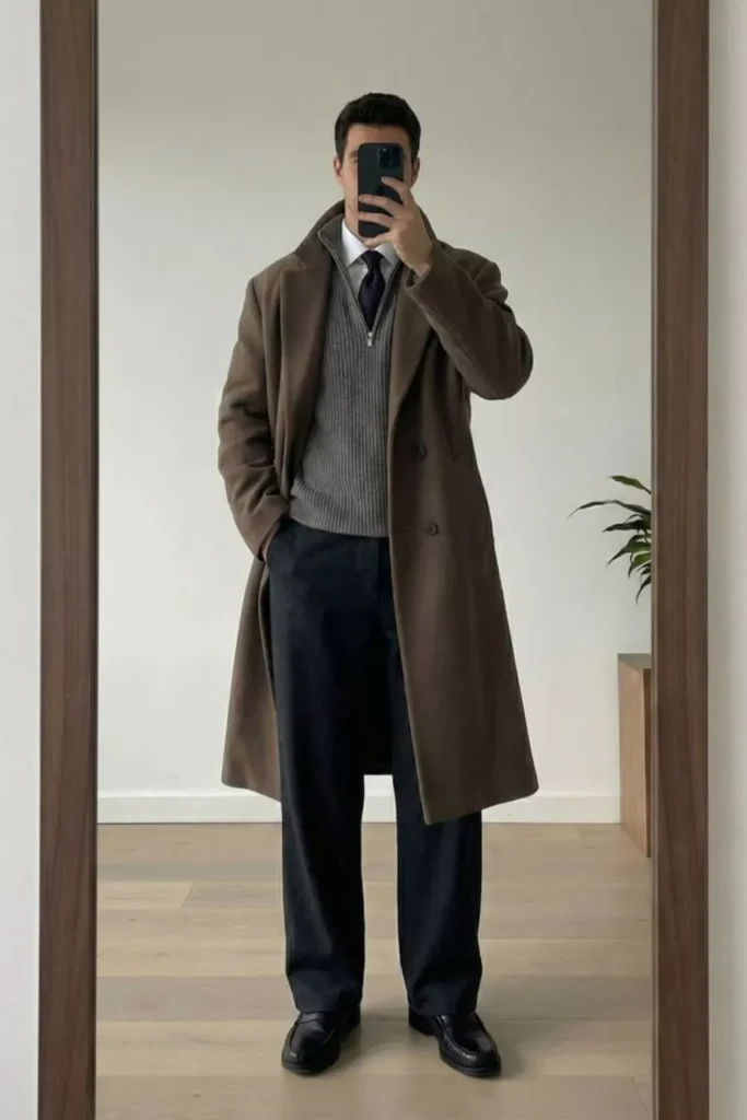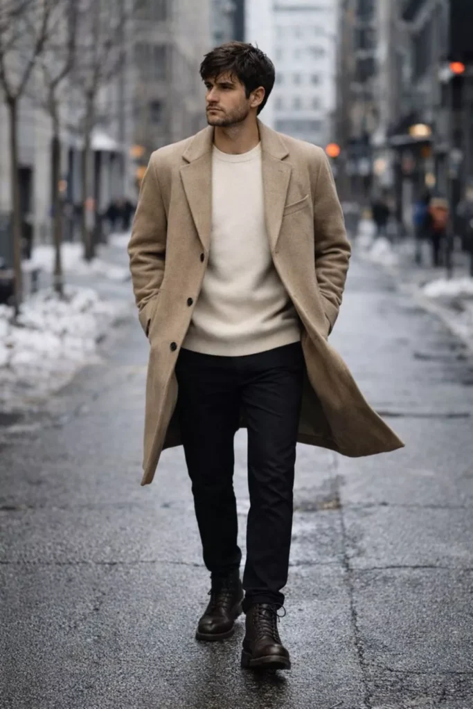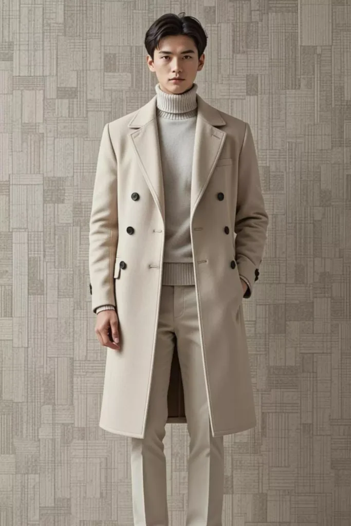 Why it’s good: An outfit can be sharp, clean, and intentional. The monochrome beige lookis expansive without looking trying hard. The coat must fit properly. Adding a turtleneck under a trench coat is solid because it adds structure and keeps it modern.