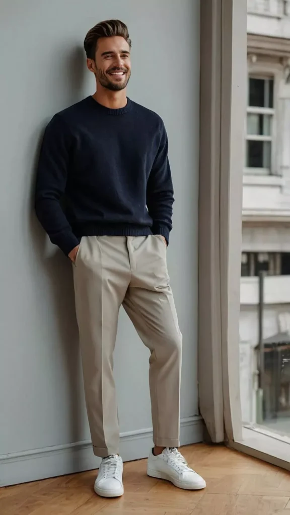 Wanna make smart casual? Try slim chinos, polos, jackets, and clean leather shoes like sneakers or Chelsea boots.