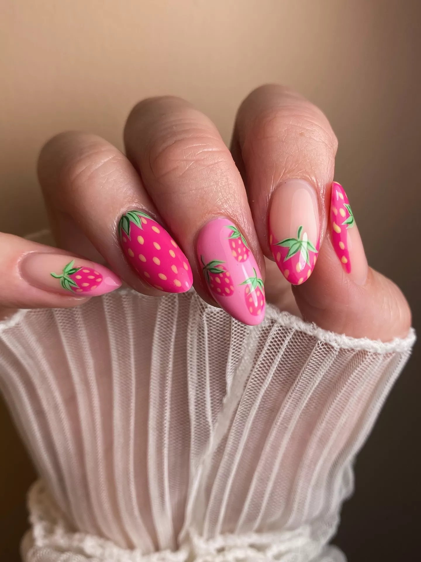 This is Summer nails 2026 pink that doesnβt play it safe. The fruit detail pops because the pink stays muted, not neon. It aligns with 2026 nail color trends that favor warmth and softness over loud saturation.