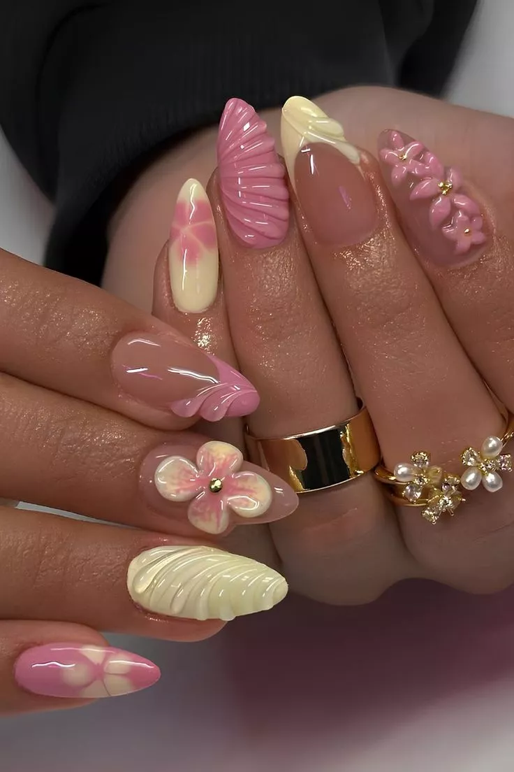 The yellow tips feel fresh, while the florals stay minimal. Most people overdo this comboβkeeping the base sheer is what makes it wearable and current.