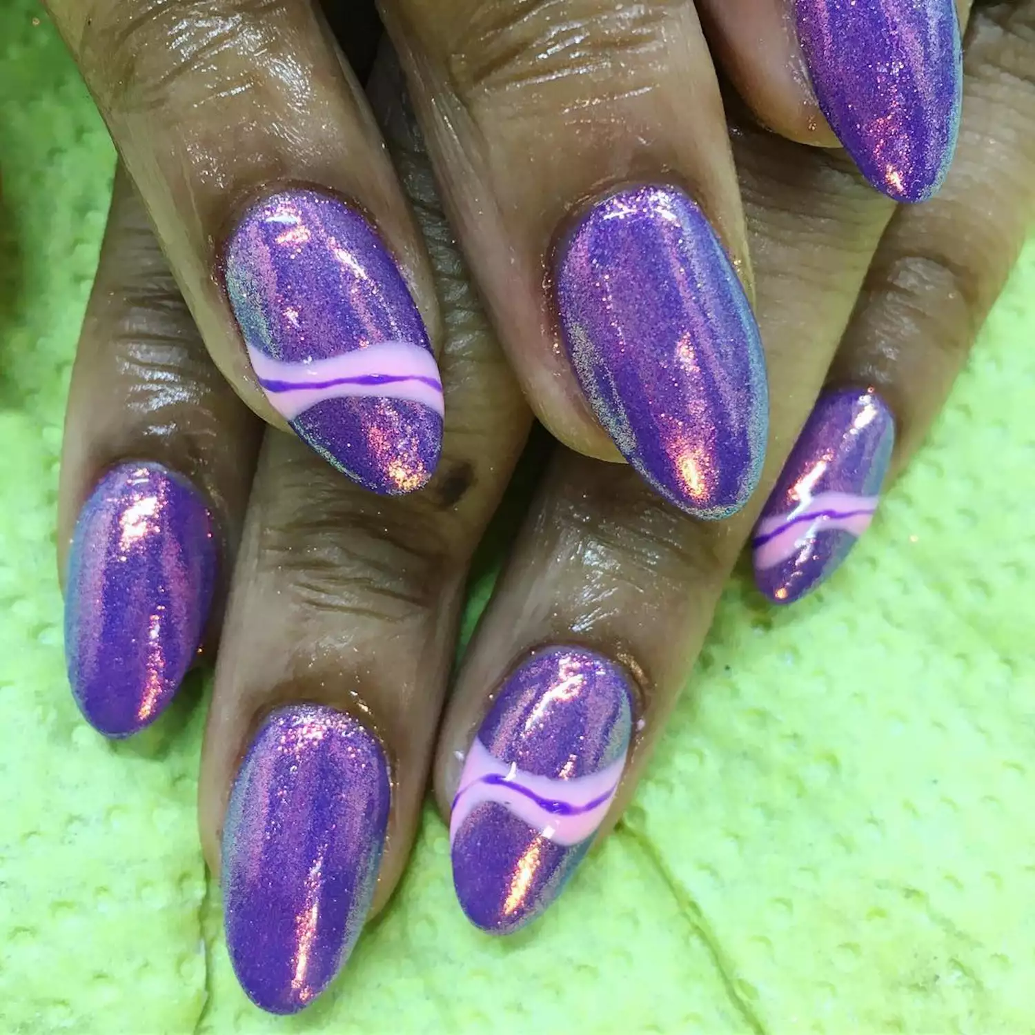 High-shine purple chrome on almond nails hits hard without extra art. The shape keeps it sleek instead of costume-y. What surprises people: this shade looks better in low light than in full sun.