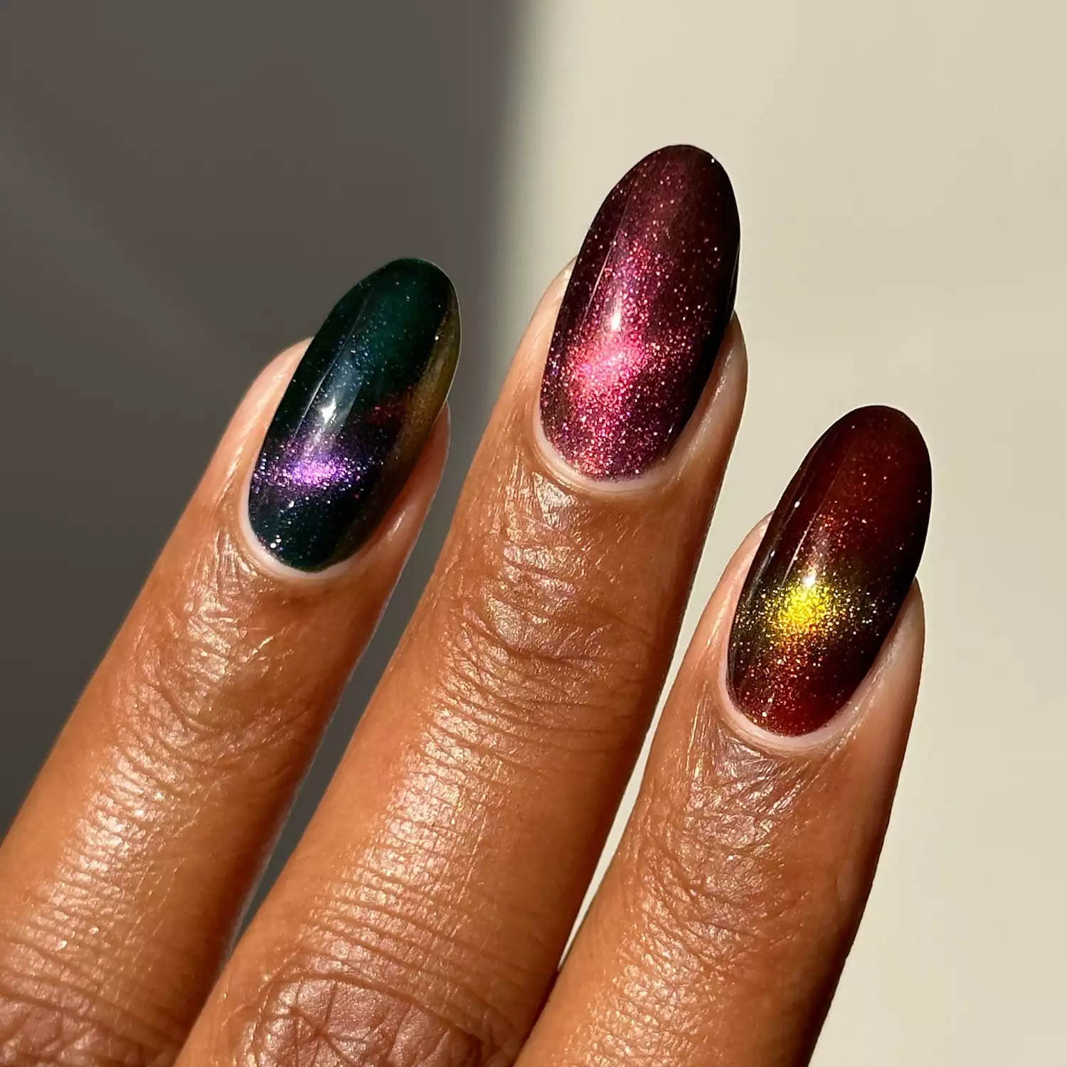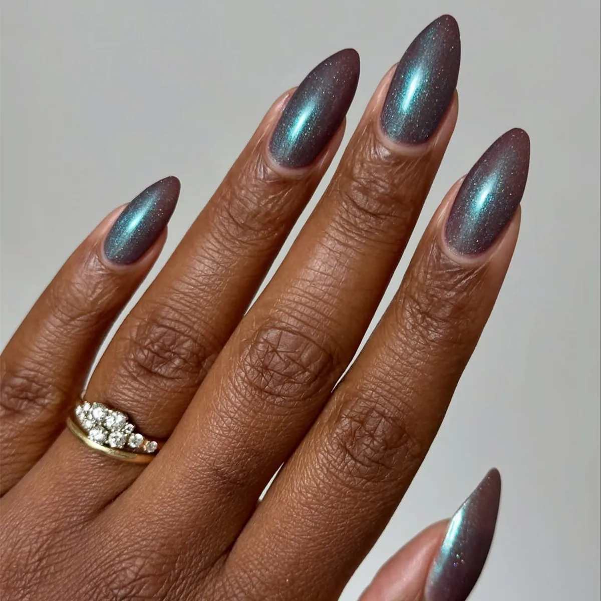 Dark almond nails with multichrome shifts look dramatic without extra design work. The color does the heavy lifting. Its galaxy-like look makes it perfect for night outings, so don’t overthink it.
