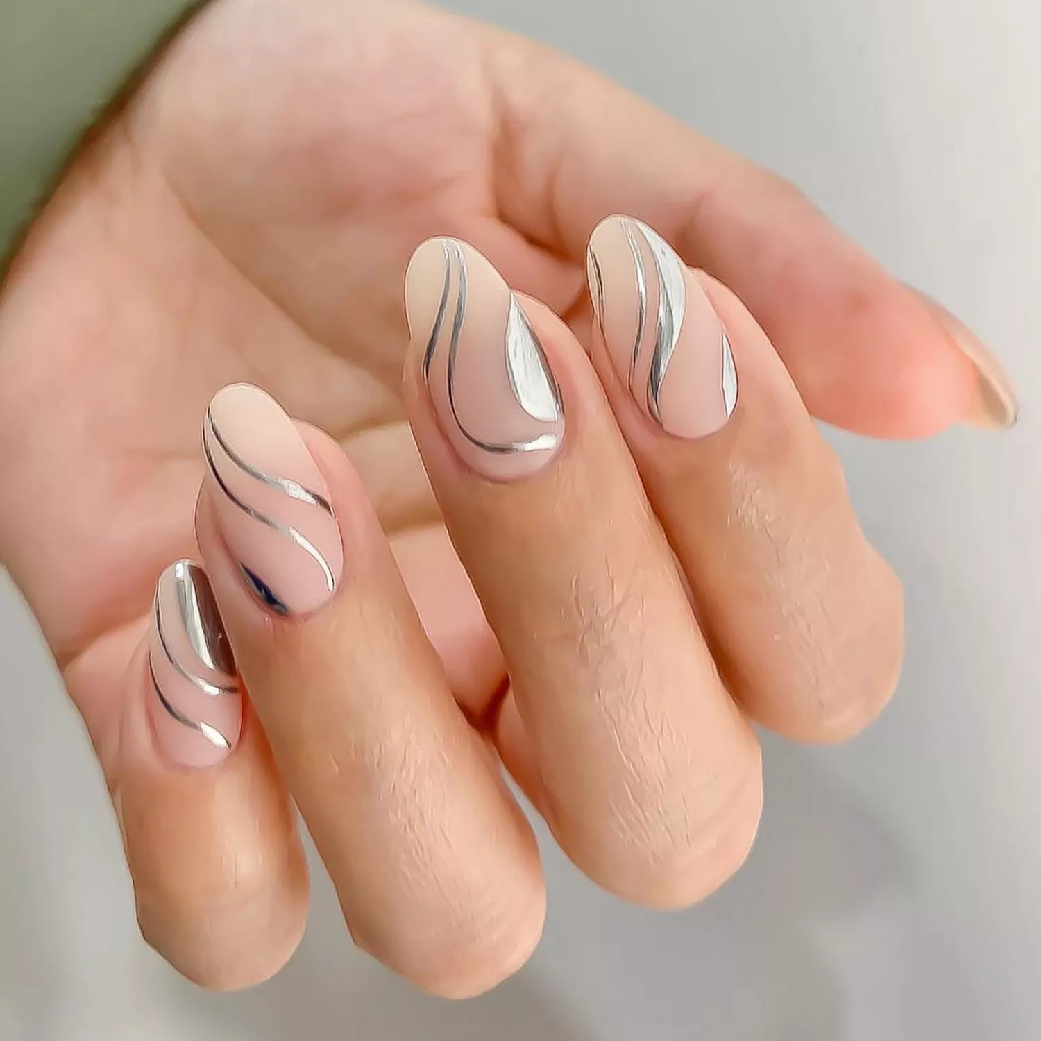 Subtle nude almond nails get an edge with metallic chrome tips. This works because the shine stays controlled. Too much chrome looks cheapāhere itās balanced, sharp, and surprisingly wearable.