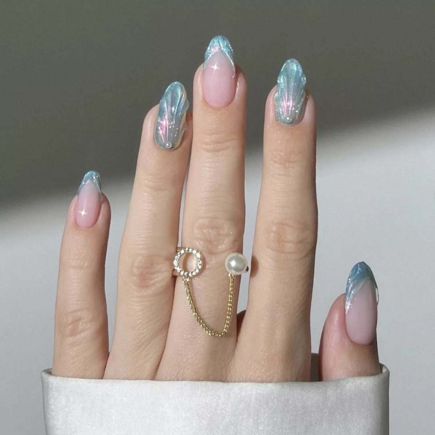 That icy blue shimmer feels like polished shells washed ashore. Subtle enough to stay elegant, reflective enough to catch sunlight and elevate simple beach outfits.