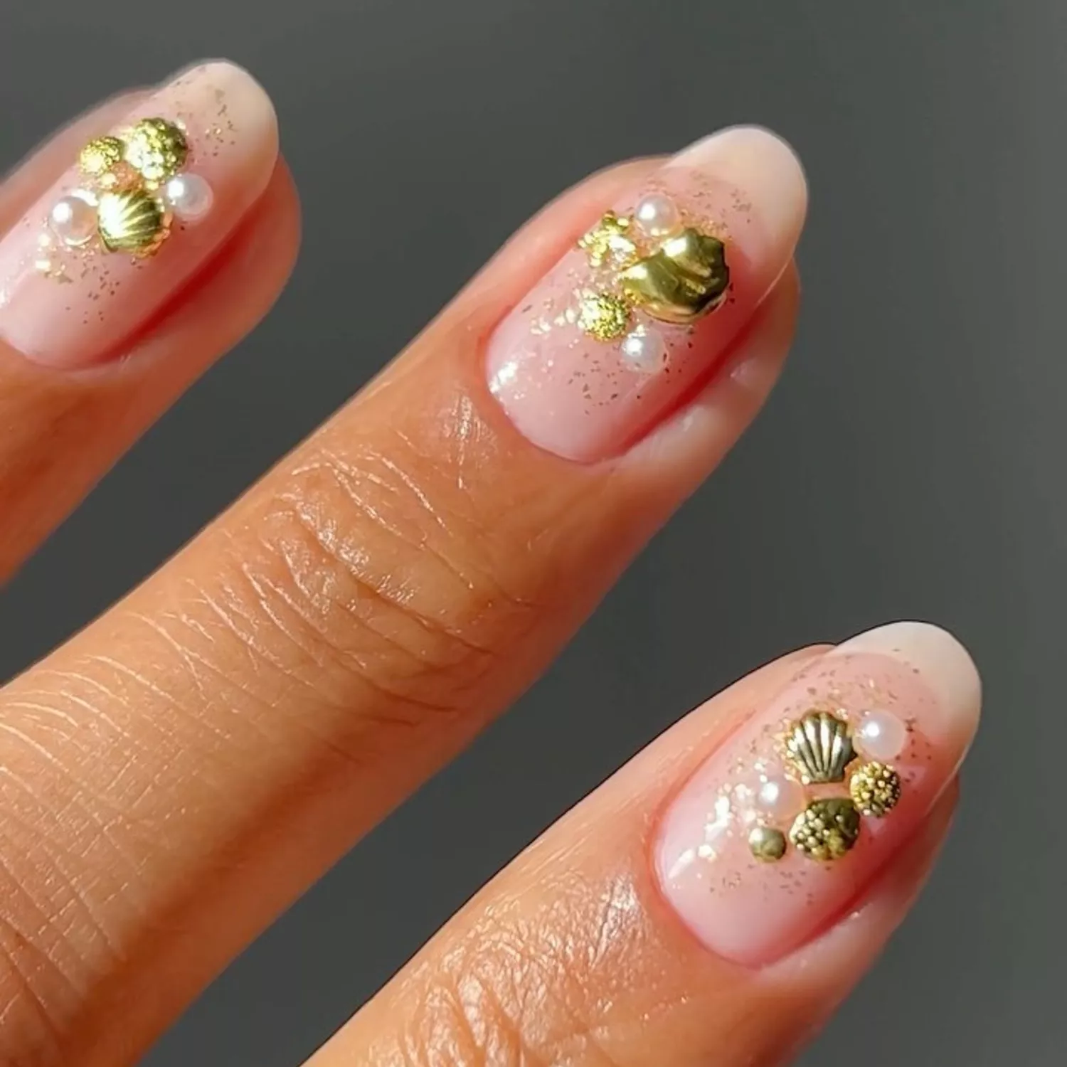 Soft pink bases with tiny metallic details feel like treasures found in the sand. They stay elegant in heat, pair with everything, and still give a subtle beach signal.