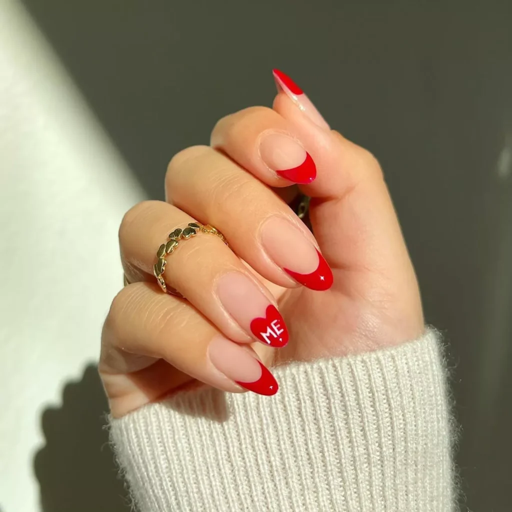 One tiny heart, clean red tip, nothing else. That restraint is the point. Most people overload this look and kill it. Here, the detail feels intentional, not decorative.