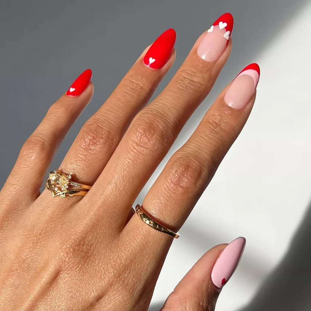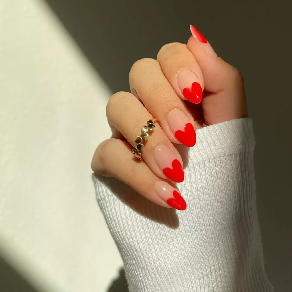 Deep red hearts on a sheer base add contrast without clutter. The shape stays clean, which matters. On square nails, this would feel heavy. Almond keeps it sharp.