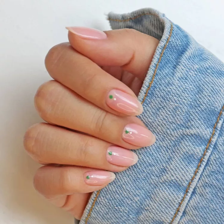 These green nails barely announce themselves. A sheer pink base with a tiny green dot sounds boring, but it works because it feels deliberate. This is for people who want detail without committing to full color.