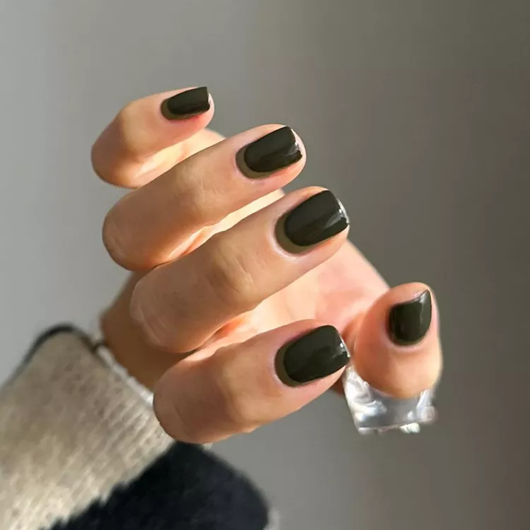 These green nails lean dark olive with a high-gloss finish that makes them look expensive, not trendy. They work because the tone is muted—no neon, no gimmicks. This shade hides chips well and ages better than brighter greens.
