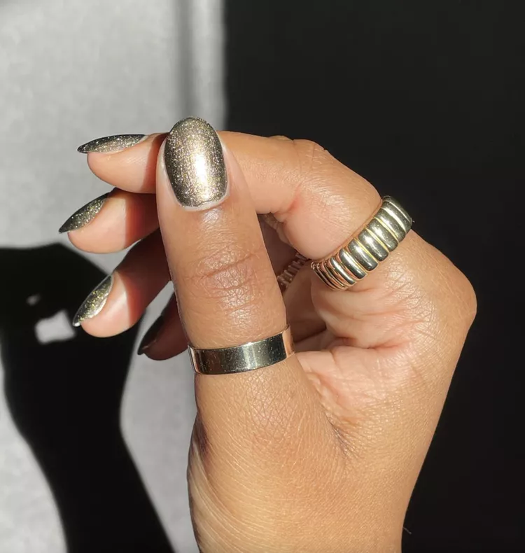This is green nails turned all the way up. Olive green nail bases with embedded glitter look dramatic, but only because the color stays earthy. Any brighter green would push this straight into costume territory.